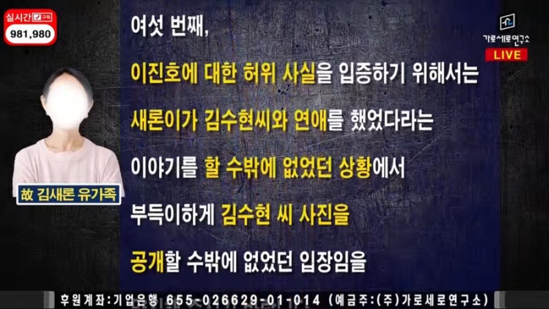 그리고 "이진호에 대한 허위 사실을 입증하기 위해서는 새론이가 김수현 씨와 연애를 했었다는 이야기를 할 수 밖에 없었던 상황에서 부득이하게 김수현 씨 사진을 공개할 수 밖에 없었던 입장임을 양지해 주시기 바란다"고 전했습니다.