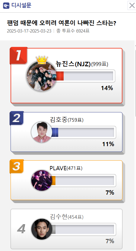 '팬덤 때문에 오히려 여론이 나빠진 스타는?' 주제의 디시 설문이 3월 17일부터 시작된 가운데 현재 뉴진스가 1위에 올라 '부정적 팬덤' 오명을 쓸 처지에 몰렸습니다.