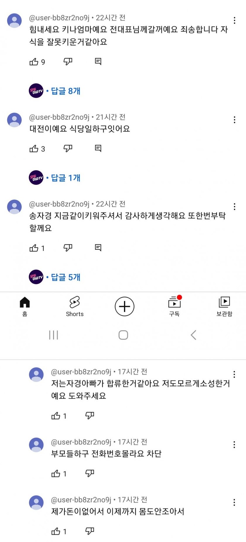 또한 키나(KEENA) 엄마는 "자경 아빠가 합류한 거 같아요. 저도 모르게 소송한 거예요. 도와주세요. 부모들 하구 전화번호 몰라요. 차단. 제가 돈이 없어서. 이제까지 몸도 안좋아서"라고 댓글을 달았습니다.