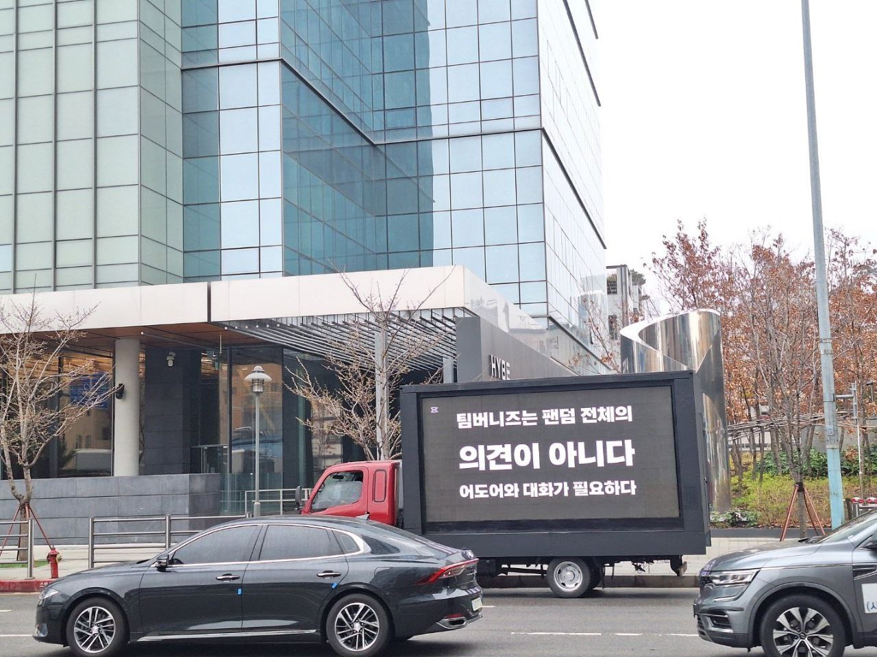 앞서, 일부 버니즈는 작년 4월 당시 하이브(HYBE) 용산 사옥 앞에서 "버니즈는 하이브 소속 뉴진스를 지지한다", "민희진은 더 이상 뉴진스와 가족을 이용하지 말라", "민희진은 타 아티스트 비방을 즉시 멈춰라" 등의 문구가 송출되는 트럭 시위가 진행된 바 있습니다.