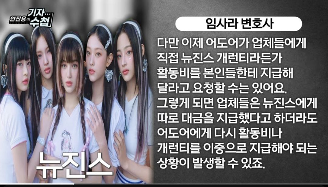 임사라 변호사는 NJZ 관련 대행업체들과 관련 "어도어가 그 업체들을 대상으로 손해배상을 청구할 수 있다고 보기는 어렵다"면서도 "다만 어도어가 업체들에게 직접 개런티라든가 활동비용을 지급해달라고 요청할 수 있다. 그렇게 되면 업체들은 뉴진스에게 따로 대금을 지급했다고 하더라도 어도어에 다시 활동비나 개런티를 이중으로 지급해야 되는 상황이 발생할 수 있다"고 말했습니다.