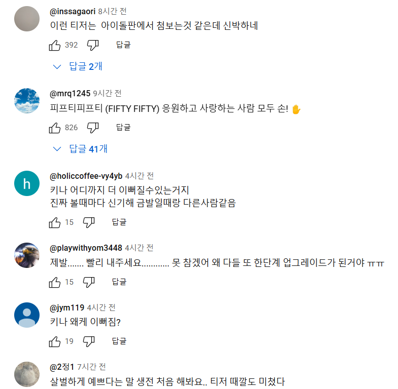 아무튼 피프피피프티와 아일릿은 서로 자매그룹으로 불릴 정도로 친밀한데 같은 컨셉트가 같은 날에 공개됐다는 점에서 대중들의 관심을 더했습니다.