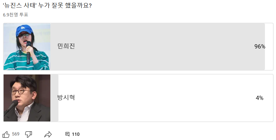 한편, '뉴진스 사태' 누가 잘못이 있는지 설문조사를 진행 중인데 현재 민희진 96%, 방시혁 4%로 나오고 있습니다.