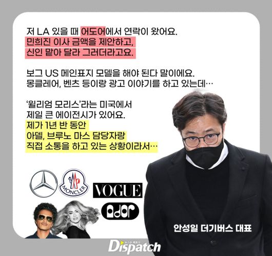 안성일은 2023년 5월 탬퍼링 녹취록에서 "저 LA 있을 때 어도어에서 연락이 왔어요. 민희진 이사가 금액을 제안하고, 거기 나오는 신인 맡아 달라 그러더라고요."라는 말을 하기도 했습니다.