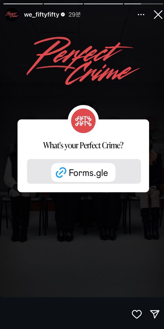 피프티피프티는 SNS에 'What`s your Perfect Crime?' 이벤트를 1일 낮 12시까지 깜짝 진행했습니다.