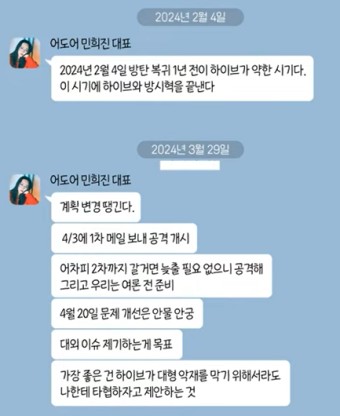 특히 작년 2월에 민희진은 "방탄 복귀 1년 전이 하이브가 약한 시기다. 이 시기에 하이브와 방시혁을 끝낸다"고 카톡 대화를 하기도 했습니다.