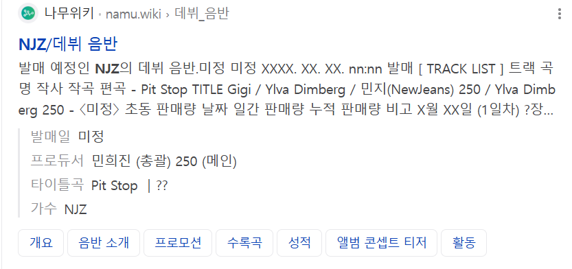 이 대목에서 NJZ 신곡 '피트 스톱(Pit Stop)' 관련 공식 발표는 되지 않았지만, SNS 상에서는 민희진이 총괄 프로듀서로 참여하고 바나(BANA) 소속 250이 프류듀서로, 그리고 뉴진스 멤버 민지가 작사에 참여했다는 이야기가 널리 퍼지고 있습니다.