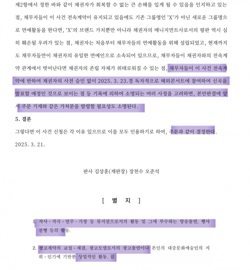 더욱이 가처분 재판부는 "채무자 뉴진스가 이 사건 전속계약에 반하여 채권자 어도어(ADOR)의 사전 승인 없이 3월 23일 독자적으로 해외콘서트에 참여하여 신곡을 발표할 예정인 것으로 보이는 점 등 기록에 의하여 소명되는 여러 사정을 고려하면, 본안 판결에 앞서 주문 기재와 같은 처분을 발령할 필요성도 소명된다"라고 구체적으로 적시했습니다.