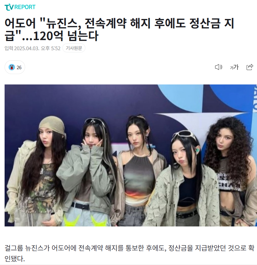이에 2023년 10월 이후 어도어가 뉴진스에게 지급한 정산금만 120억원이 넘습니다.