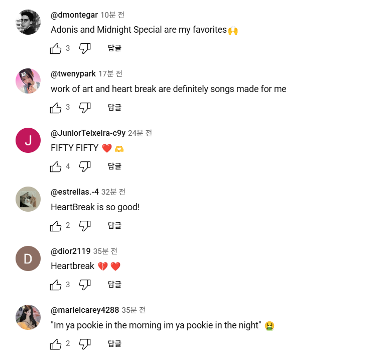 "잠깐 들어봤는데 모든 노래가 다 좋았어요. 피프티피프티는 이름은 실망스럽지 않습니다. 어떤 노래를 좋아하시나요? 아직도 결정을 내릴 수 없네요. 4월29일 전체 노래를 들어봐야 겠네요"