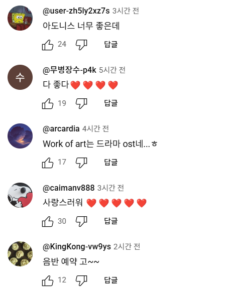 해외 네티즌들도 아도니스, 푸키, 하트브레이크, 워크 오브 아트 등 골고루 좋은 반응을 보이고 있었습니다.