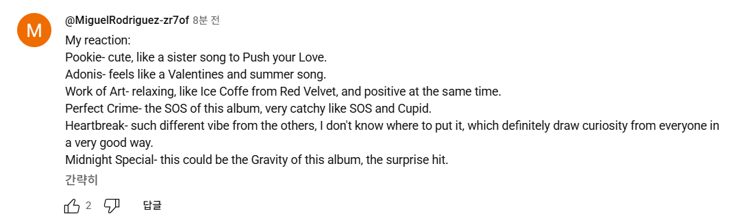 "솔직히 이번 앨범이 이전 두 장의 미니 앨범을 능가할 것 같아요! 왜 그들이 먼저 완벽한 범죄를 저질렀는지 알겠어요. 나머지 노래들은 너무" 좋게 들리네요, 정말 멋진 일들을 기대하고 있어요!! 😝"