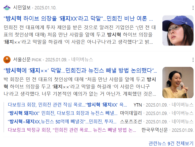 특히 민희진은 1년 전, 작년 4월 25일 기자회견에서 방시혁 의장에 대해 뉴진스를 홀대했다는 비판을 하면서 르세라핌(LE SSERAFIM), 아일릿(ILLIT) 등에 좌표 찍는 공격을 감행한 바 있습니다.
