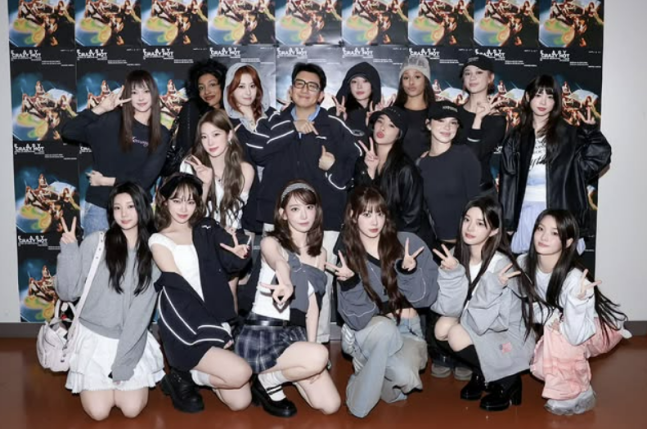 방시혁 의장이 하이브(HYBE) 소속 걸그룹 르세라핌(LE SSERAFIM), 아일릿(ILLIT), 캣츠아이(KATSEYE) 멤버들과 함께 찍은 단체 사진을 SNS에 공개했습니다.