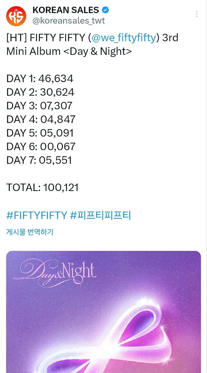 피프티피프티 세번째 미니 앨범 '데이 앤 나잇(Day & Night)'이 발매 이후 1주일간 초동 판매량 10만장을 돌파했습니다.