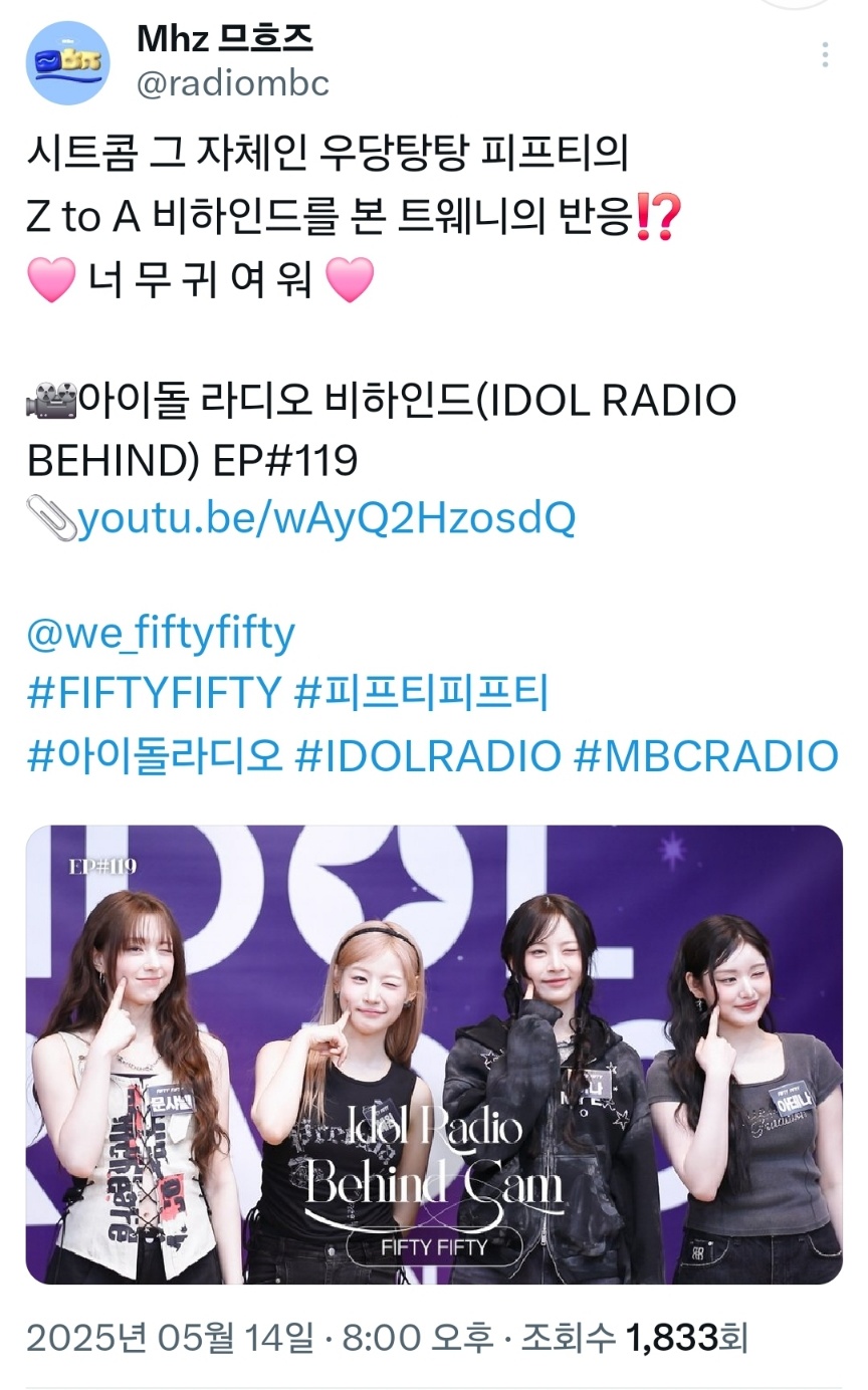 MBC 라디오 'Mhz 므흐즈' 유튜브는 '우당탕탕 피프티의 Z to A 비하인드🎀 여기서 절대 탈출 불가🤭'라는 제목으로 '아이돌라디오 비하인드' 영상을 공개했습니다.