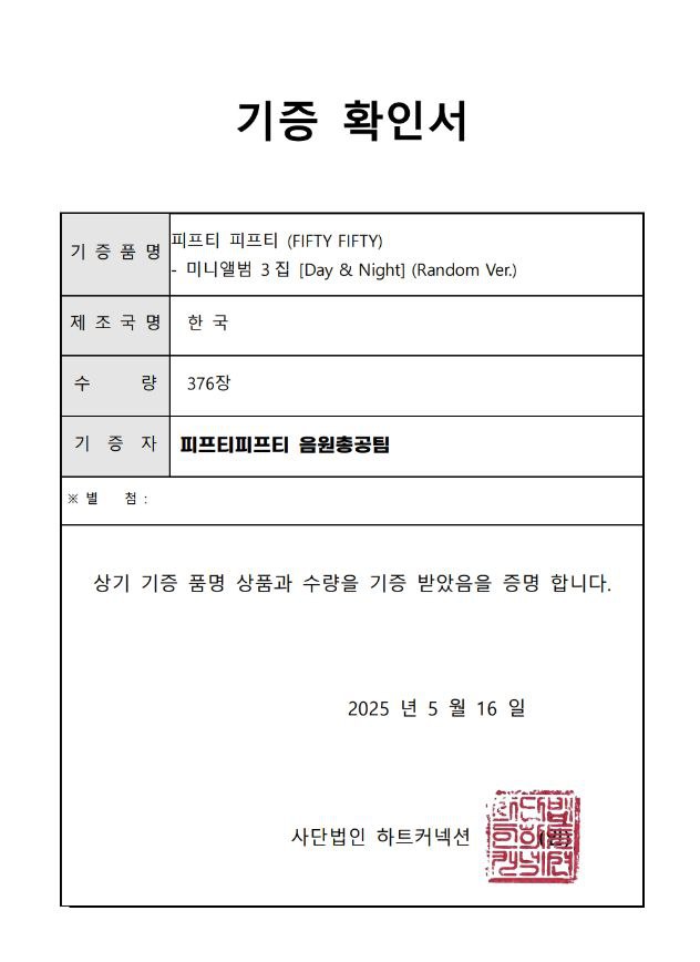 피프티피프티 팬덤 '트웨니(TWENY)' 음원총공팀은 사단법인 하트커넥션에 '데이 앤 나잇(Day & Night)' 앨범 376장을 기부했습니다.