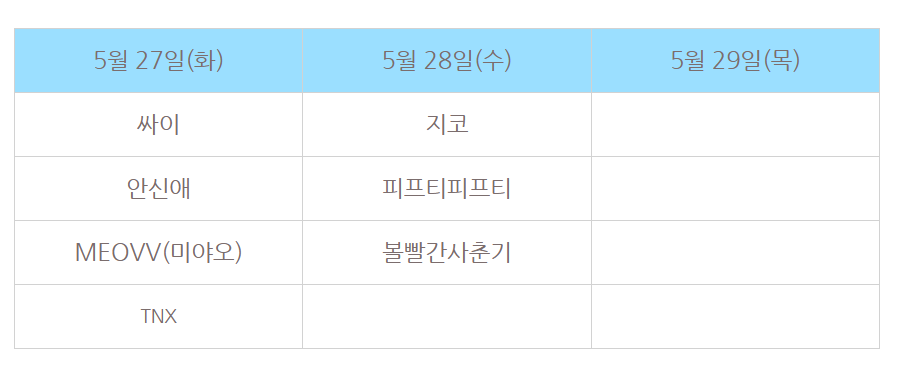 27일에는 싸이, 안신애, 미야오(MEOVV)가 라인업으로 예정돼 있습니다.