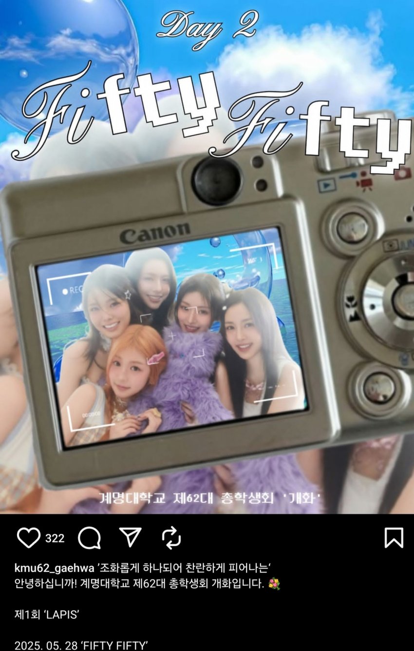 앞서 피프티피프티는 지난 13일 구미대학교 축제, 20일 대구대학교 축제에서 초청 공연을 한 바 있어 경상도 지역에서 '축제의 여왕'으로 자리매김하고 있습니다.