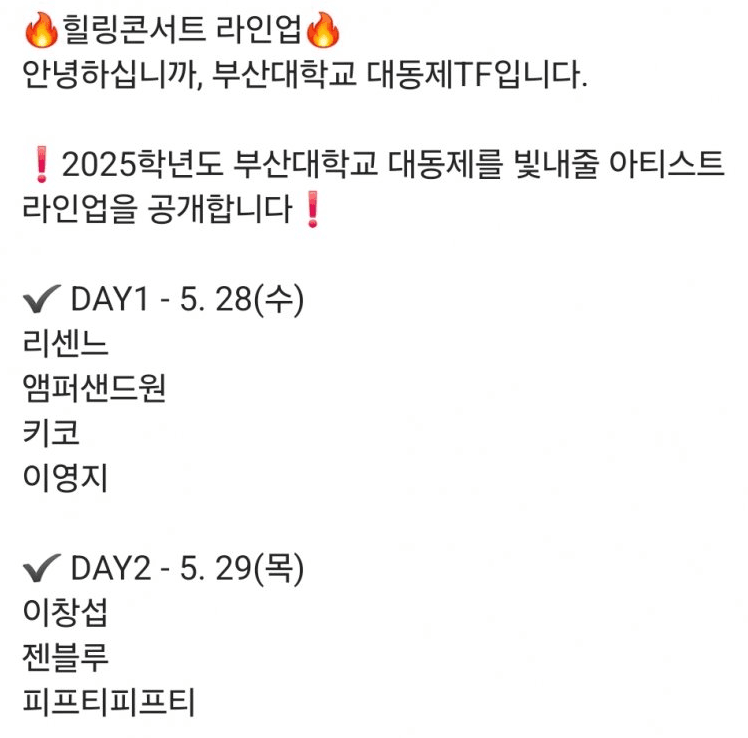 부산대 축제는 28일에 리센느, 앰퍼샌드원, 키코, 이영지 등이 라인업에 올라 있습니다.