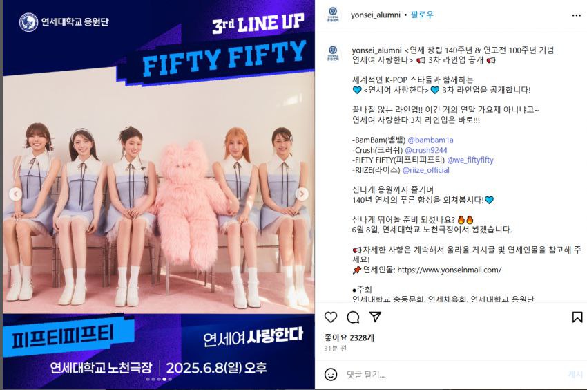 연세대 공식 SNS에는 "세계적인 K팝 스타들과 함께하는 <연세여 사랑한다> 3차 라인업을 공개합니다!"라면서 "끝나질 않는 라인업!! 이건 거의 연말 가요제 아니냐고~"라고 강조했습니다.