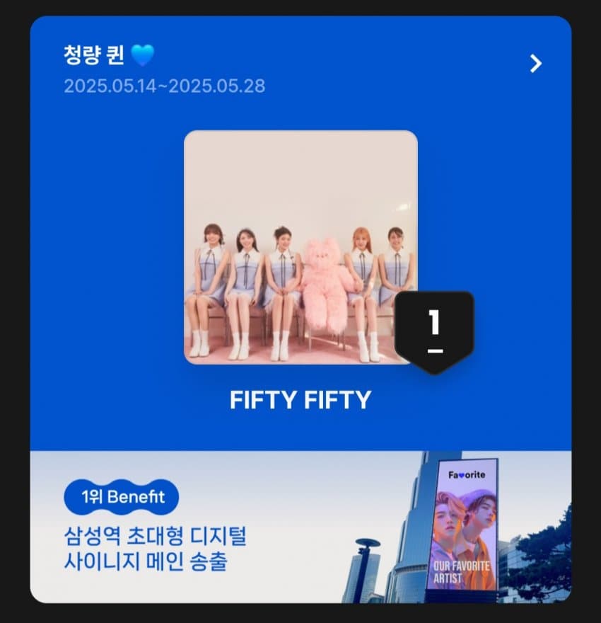 1위 특전으로는 삼성역 코엑스 미디어타워 초대형 디지털 사이니지 메인에 5월31일부터 6월13일까지 피프티피프티 영상이 송출됩니다.