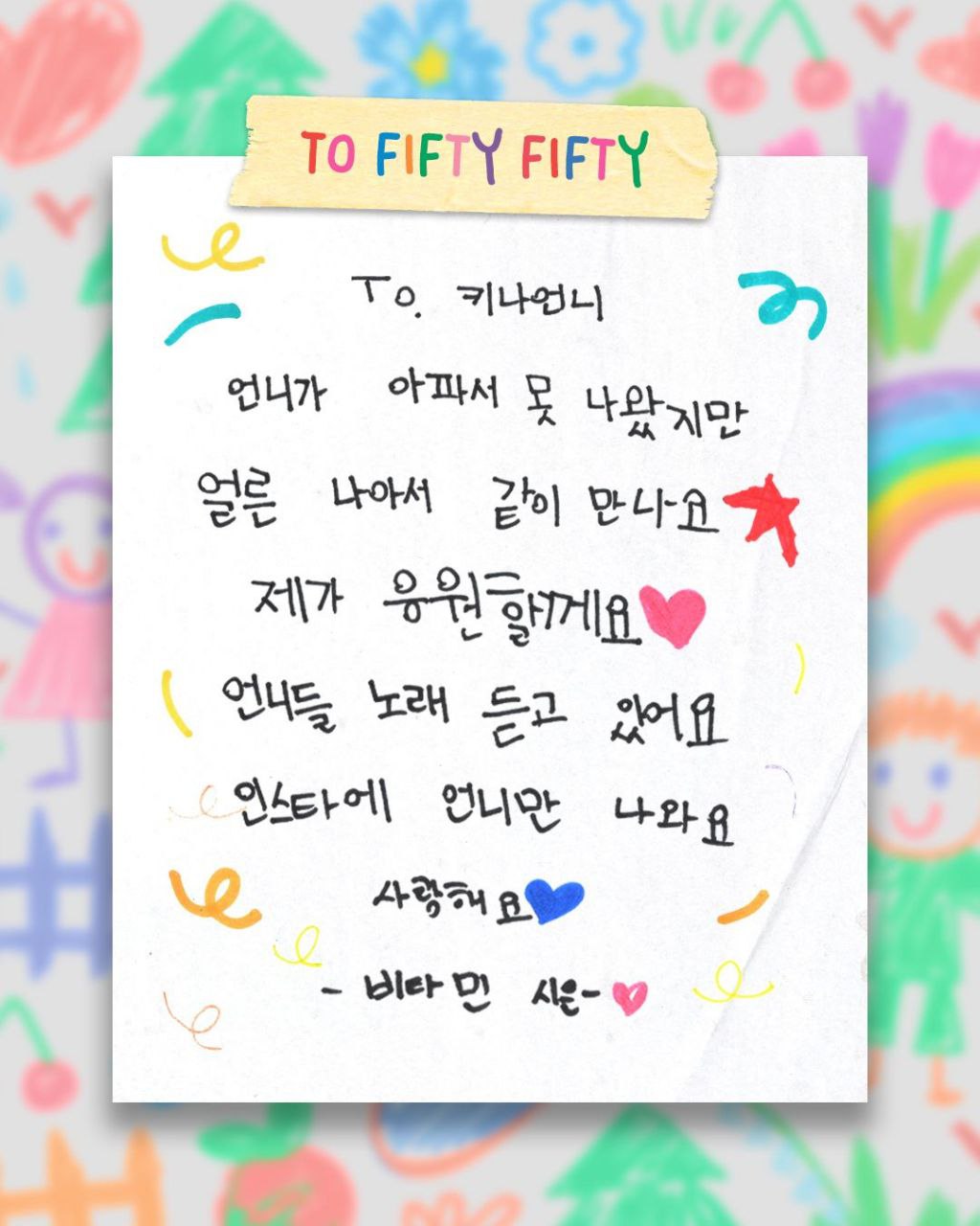 "키나야, 다 훌훌 털어버리고 힘내서 일어나, 이럴 때 더 키나가 좋아하는 음악하면서 더 강한 모습 보여주며 난 아무렇지도 않다는 걸 보여줘. 그게 이기는 거야. 힘내고. 그와 그들 없이도 키나와 피프티피프티는 더 잘나간다는 걸 보여줘"