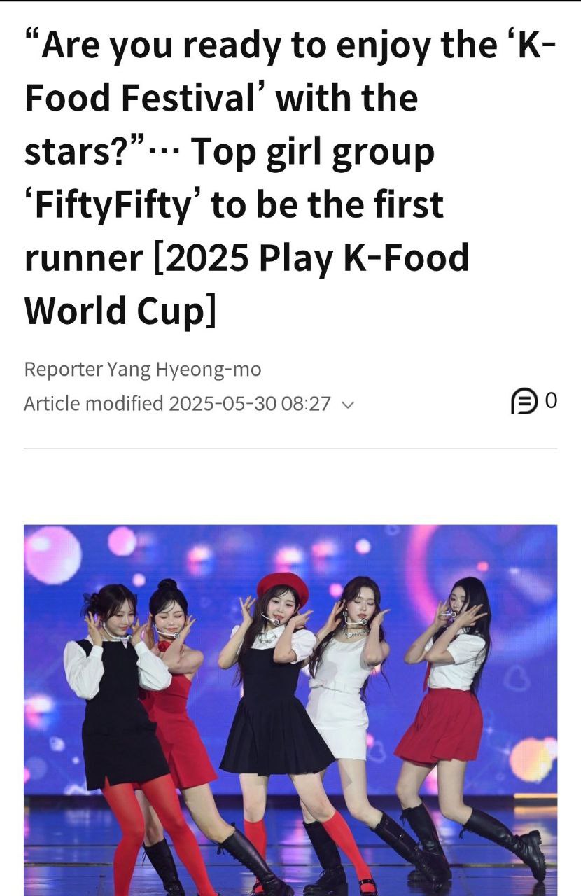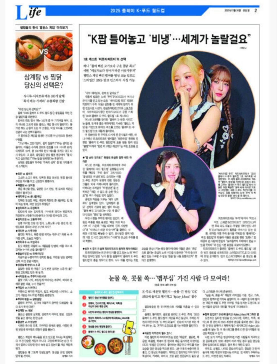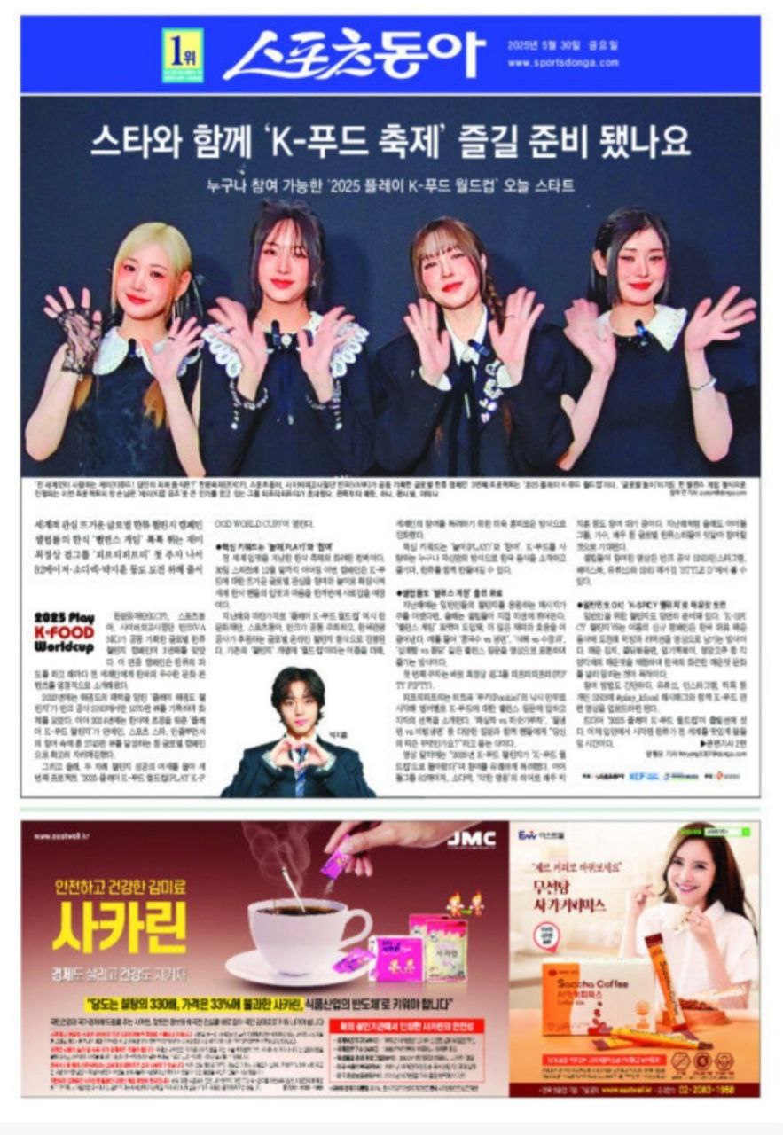 피프티피프티가 글로벌 한류 챌린지 캠페인 ‘2025 플레이 K푸드 월드컵(PLAY K-FOOD WORLD CUP)’에서 1호 게스트로 나섰는데 스포츠동아 온라인은 물론 오프라인 지면매체에서 톱기사로 사진과 함께 대서특필됐습니다.