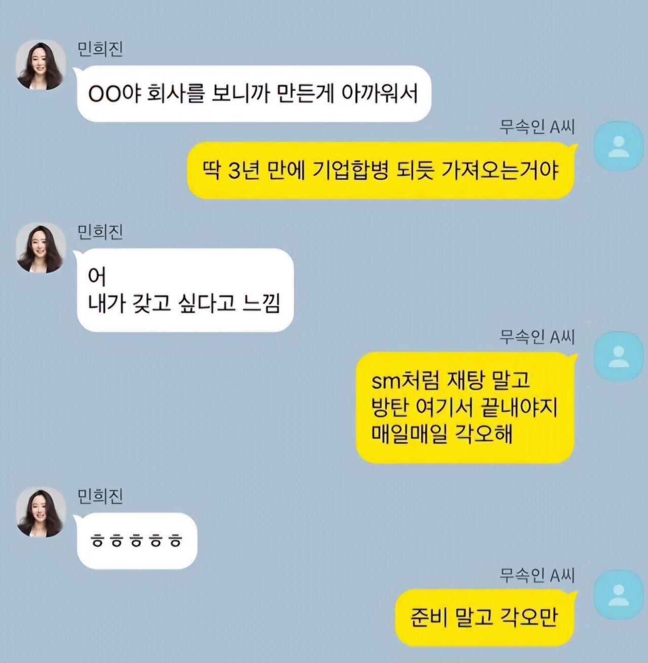 무당의 "SM처럼 재탕 말고 방탄(소년단) 여기서 끝내야지 매일매일 각오해"라는 글에 민희진은 "그럼 일단 4월에 내 레이블 기획을 완료하고 쏘스뮤직은 걍 내 의견대로 양보없이 밀어부치고"라고 답변습니다.