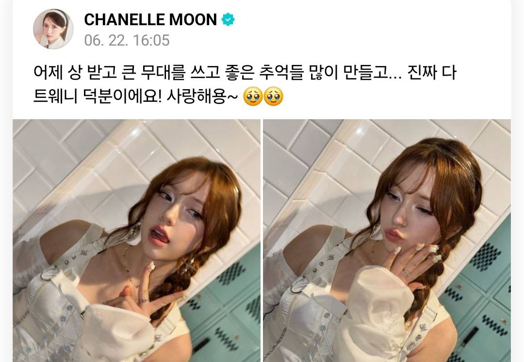 문샤넬은 위버스 커뮤니티에 "어제 상 받고 큰 무대를 쓰고 좋은 추억들 많이 만들고... 진짜 다 트웨니 덕분이에요! 사랑해용~ 🥹🥹"라는 글을 올렸습니다.