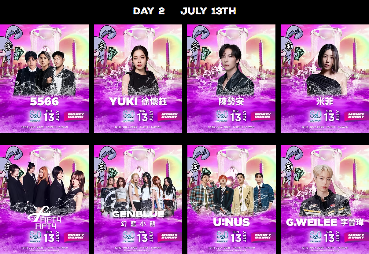 세계 최대 규모의 워터 뮤직 페스티벌 중 하나이자 대만 최대 페스티벌인 'S2O 타이완 2025'가 대만 수도 타이베이 다지아 리버 파크에서 열리는 가운데 피프티피프티(FIFTY FIFTY)는 7월13일 머니버니(MONEYBUNNY) 스테이지 라인업으로 초청돼 있습니다.