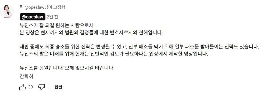 영상 댓글에 송혜미 변호사는 “뉴진스가 잘 되길 원하는 사람으로서 본 영상은 현재까지의 법원의 결정들에 대한 변호사로서의 견해입니”라며 “재판 중에도 최종 승소를 위한 전략은 변경될 수 있고, 전부 패소를 막기 위해 일부 패소를 받아들이는 전략도 있습니다”라고 설명했습니다.