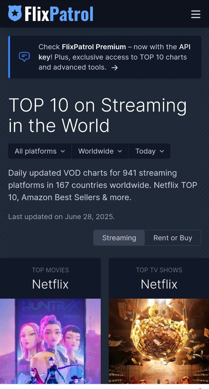 온라인 콘텐츠 순위 집계 사이트 플릭스패트롤에 따르면 <케이팝 데몬 헌터스>는 넷플릭스 영화 전체 1위에 올랐습니다.