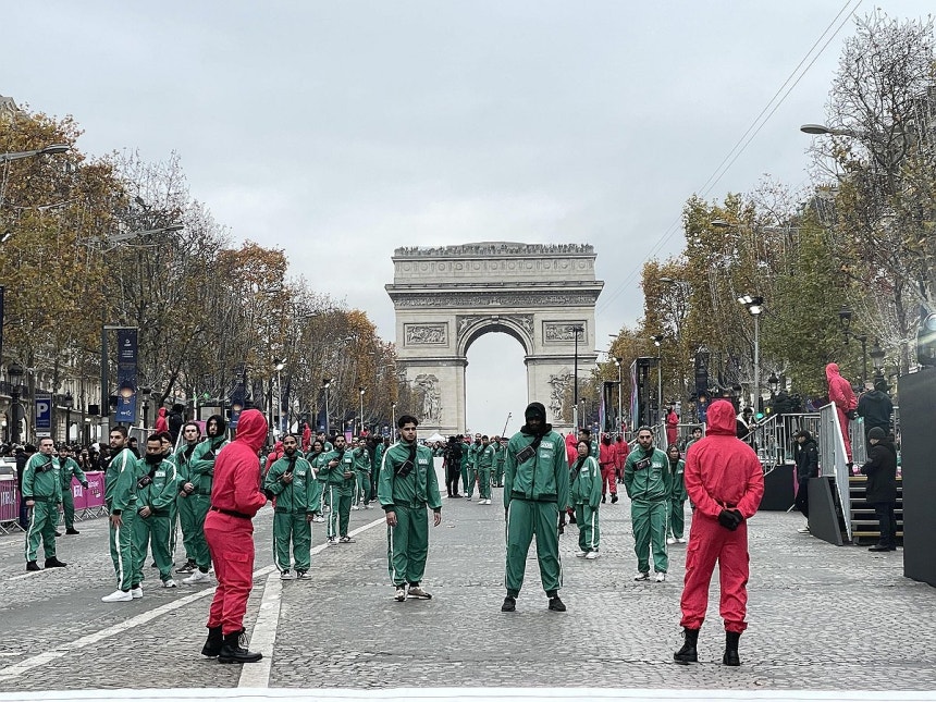 시즌2 공개를 앞두고 프랑스 파리의 번화가인 샹젤리제에서는 드라마 속 게임인 '무궁화꽃이 피었습니다'를 재현하는 이벤트가 열렸습니다.