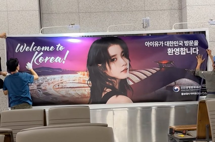 배너에는 "Welcome to Korea! 아이유가 대한민국 방문을 환영합니다"라는 문구가 적혀 있었습니다.