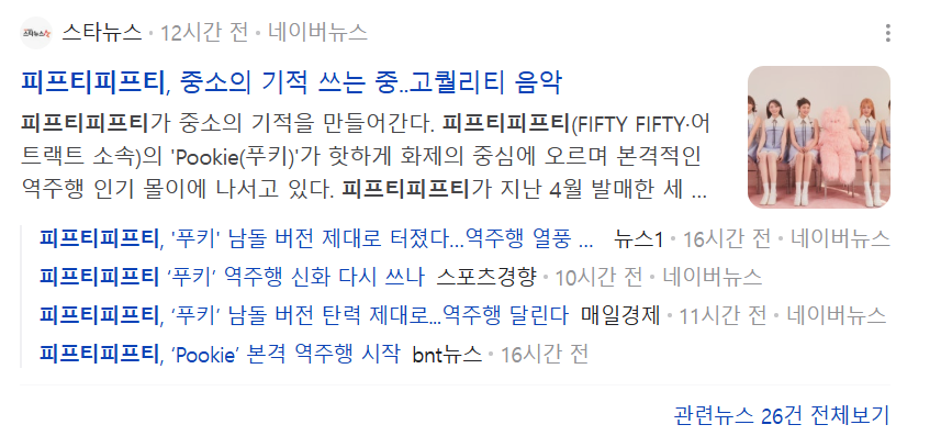 언론에서는 "피프티피프티, 중소의 기적 쓰는 중..고퀄리티 음악", "피프티피프티, '푸키' 남돌 버전 제대로 터졌다…역주행 열풍 계속", "피프티피프티, 또 한번 중소의 기적 쓴다…‘Pookie’ 역주행", "피프티피프티, 또 시작된 '역주행' 신화…아픔 딛고 돈방석 앉나" 등 기사를 쏟아내며 놀라움을 전했습니다.