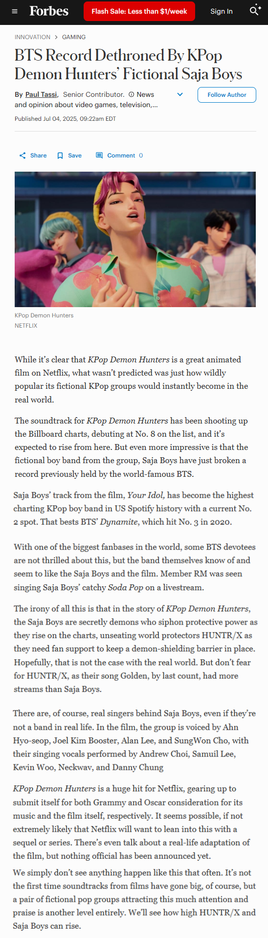 미국 유명 매체 포브스가 'BTS 기록, K팝 데몬 헌터스(KPop Demon Hunters)의 가상 그룹 사자보이즈(Saja Boys)에게 뺏기다'라는 제목의 보도를 했습니다.