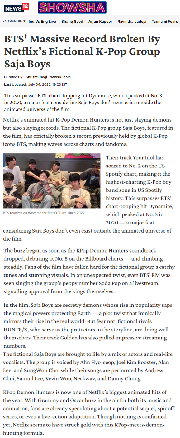 미국 포브스 기사에 따르면 "넷플릭스에서 K팝 데몬 헌터스(KPop Demon Hunters)가 훌륭한 애니메이션 영화라는 점은 분명하지만, 그 안의 가상 K팝 그룹들이 실제 세계에서 이렇게 폭발적인 인기를 얻게 될 줄은 아무도 예상하지 못했다"고 보도했습니다.