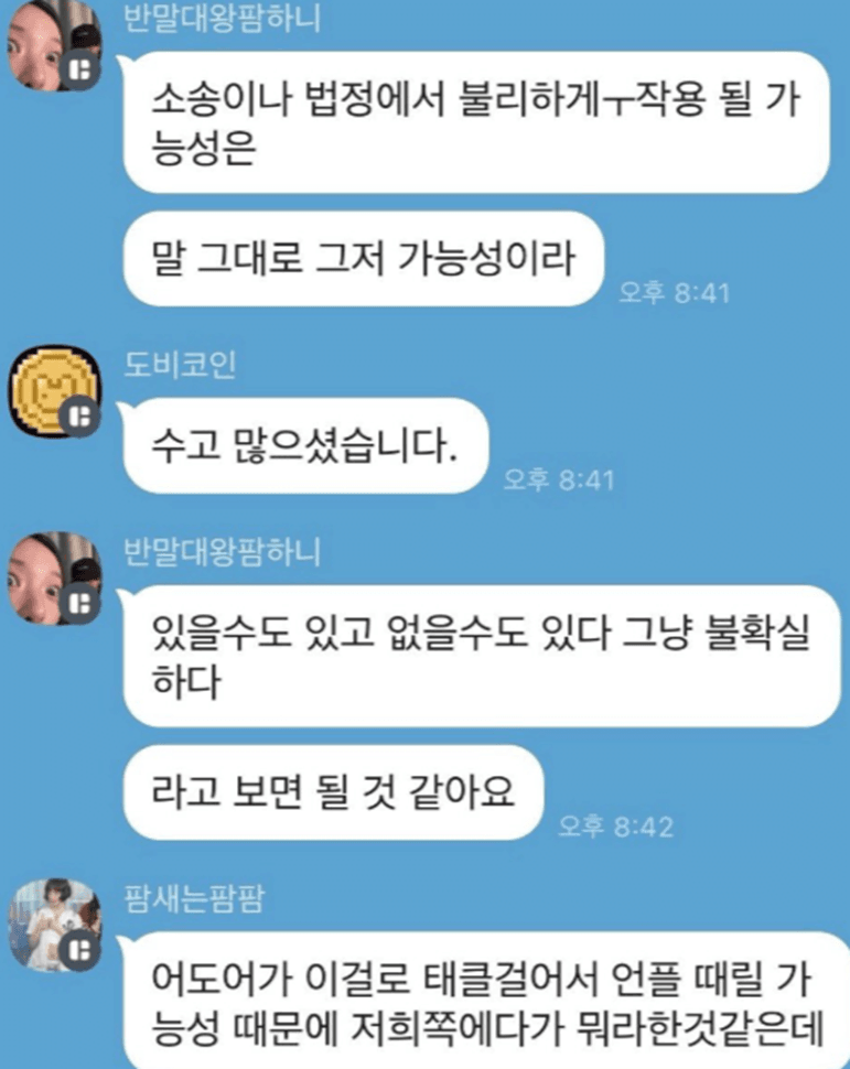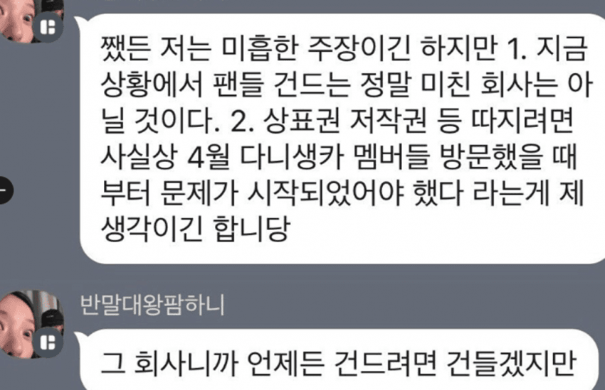 대외적으로는 "민희진이 없는 어도어(ADOR)는 짭도어"라고 욕하면서도 자기들끼리는 "설마 문제를 삼겠어? 예전 생일 카페 때도 저작권 위반 했는데 이제 와서 문제삼겠어?" 라는 비양심적 마인드라는 비판이 나오는 대목입니다.