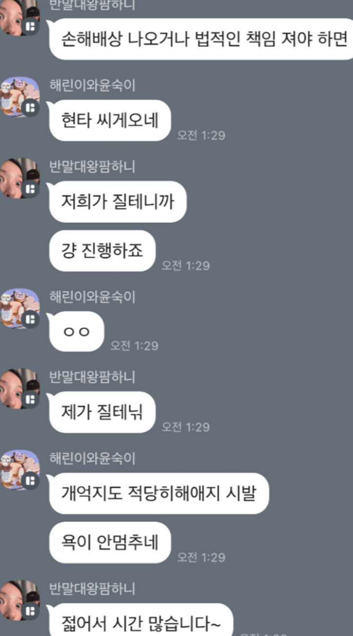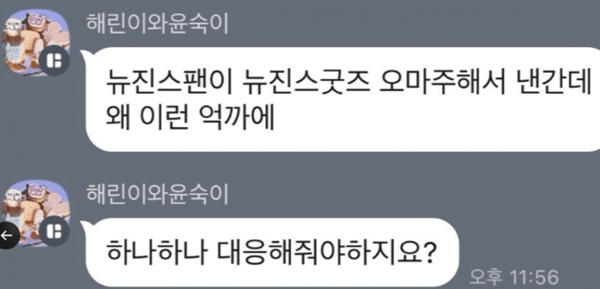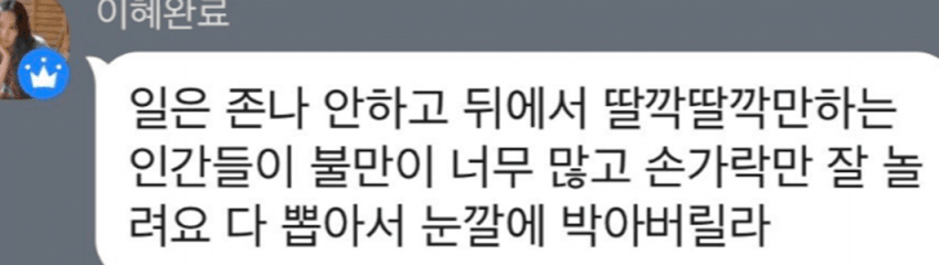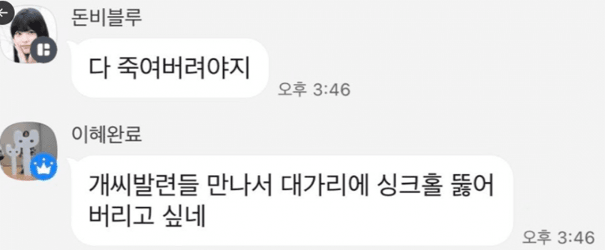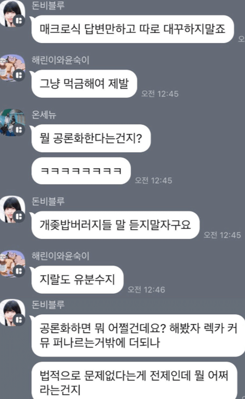 이런 상황에서 뉴진스갤러리 운영진은 이러한 항의를 무시하고 단체 카카오톡 방에서 X쪽 팬들을 조롱하고 심각한 막말을 했습니다.