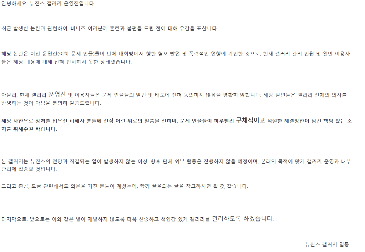 이상과 같이 "뉴진스갤러리는 향후 단체 외부 활동은 진행하지 않을 예정이며, 본래의 목적에 맞게 갤러리 운영과 내부 관리에 집중할 것"이라고 밝혔습니다.