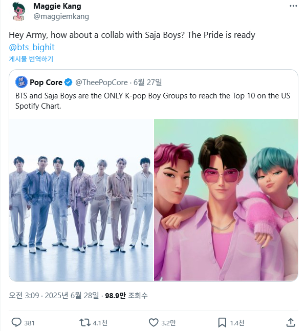 이와 함께 매기 강 감독은 방탄소년단과 ‘케이팝 데몬헌터스’ 캐릭터 사자 보이즈가 K팝 보이 그룹 중 유일하게 미국 스포티파이 미국 데일리 톱 송 차트 톱 10에 진입했다는 소개 글을 첨부했습니다.