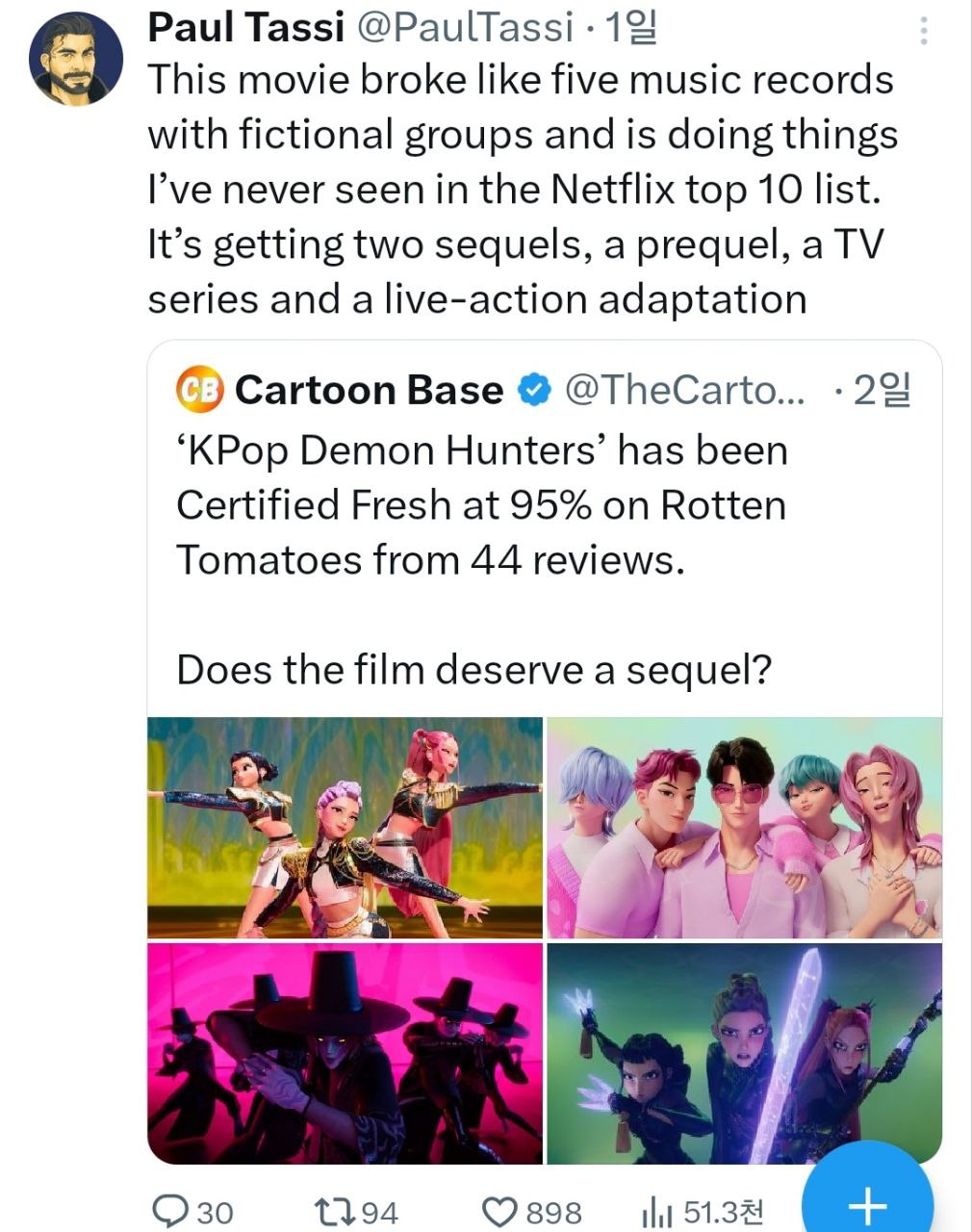 폴 타시 기자는 "케이팝 데몬 헌터스'는 로튼 토마토에서 44개의 리뷰를 바탕으로 신선도 지수 95%를 인증받았다"는 글에 새로운 정보를 추가로 밝힌 것이었습니다.