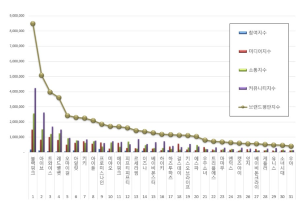 걸그룹 브랜드평판 7월 순위 50위까지는 블랙핑크, 아이브, 트와이스, 레드벨벳, 오마이걸, 아일릿, 키키, 아이들, 프로미스나인, 미야오, 에이핑크, 피프티피프티, 르세라핌, 이즈나, 베이비몬스터, 하이키, 하츠투하츠, 걸스데이, 키스오브라이프, 에스파, 우주소녀, 트리플에스, 마마무, 엔믹스, 캣츠아이, 잇지, 베이비돈크라이, 케플러, 유니스, 소녀시대, 우아, 스테이씨, 비비지, 이달의소녀, 리센느, 시그니처, 드림캐쳐, 키라스, EXID, 브라운아이드걸스, 수피아, 브브걸, 빌리, 클라씨 , 유스피어, 이프아이, 위클리, 세이마이네임, 버비, 힛지스 순이었습니다.