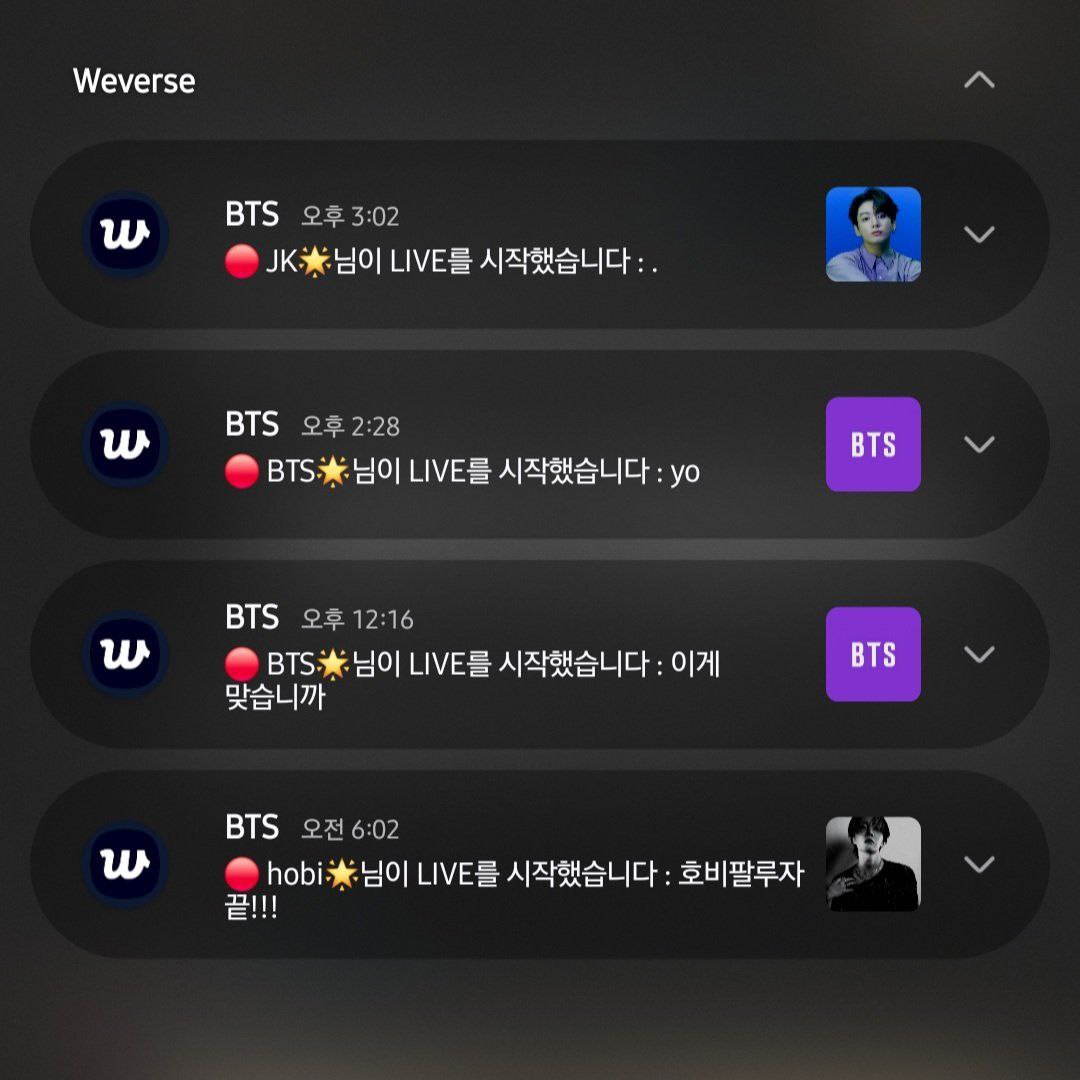 이후 제이홉은 위버스 라이브 방송을 진행했고 이어 지민 & 정국, 뷔, 정국 등 순으로 잇달아 라이브 방송이 계속돼 팬들을 즐겁게 했습니다.