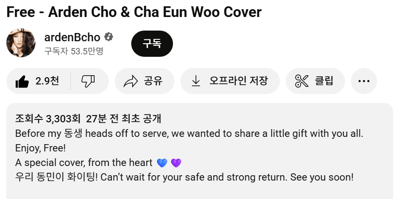 아덴 조는 27일 '프리, 아덴조 차은우 커버'라는 제목의 유튜브 영상에서 "동생이 군대에 가기 전에, 여러분과 작은 선물을 나누고 싶었어요. 즐기세요, Free!