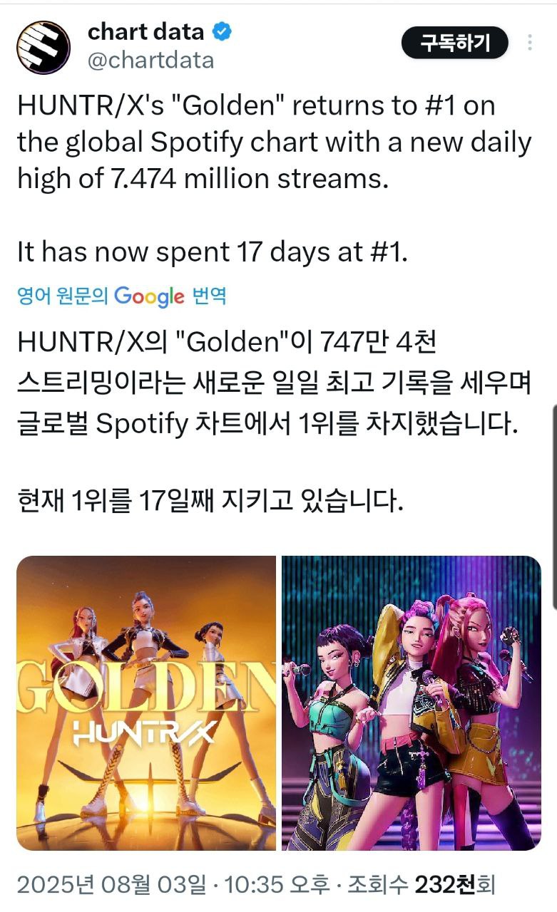'골든'은 글로벌 스포티파이에서 17일 이상 1위을 차지하고 있습니다.