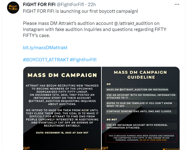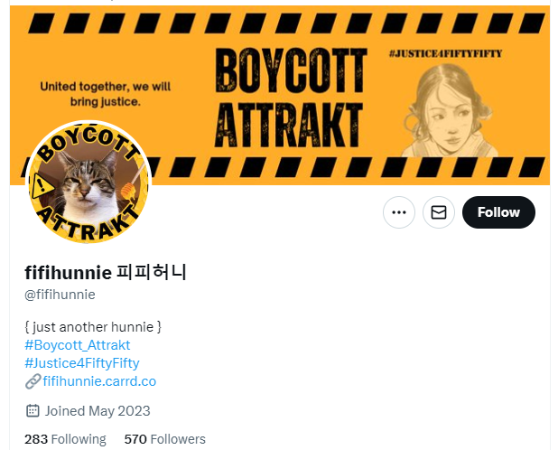 과거 어트랙트에 대한 보이콧이 해외 피프티 팬들 연합, 즉 허니즈유나이티드라고 했는데 이제는 K팝 팬들이라고 하고 있습니다.