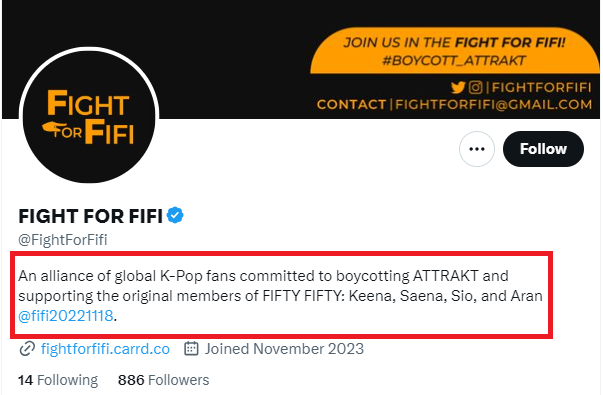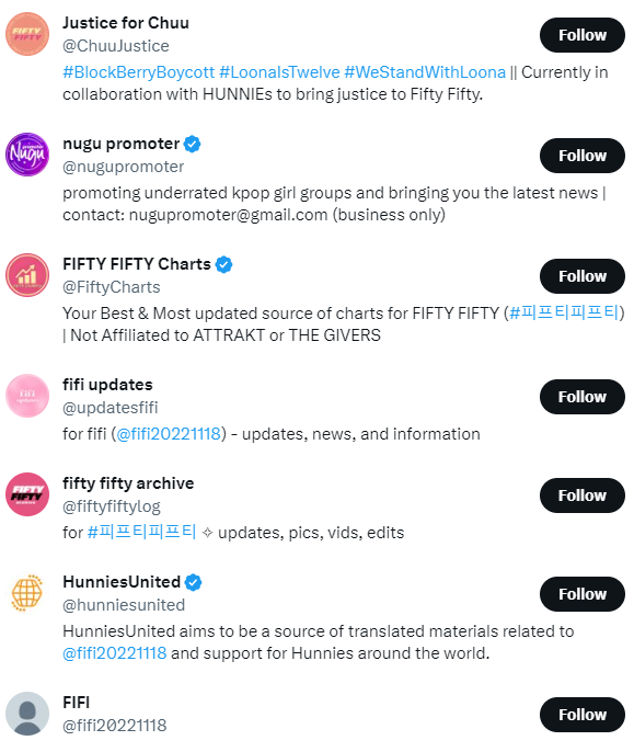 '파이트 포 피피' 계정은 키나를 응원하는 순수 피프티피프티 한국팬들 관련 엑스 계정은 모두 차단했습니다.