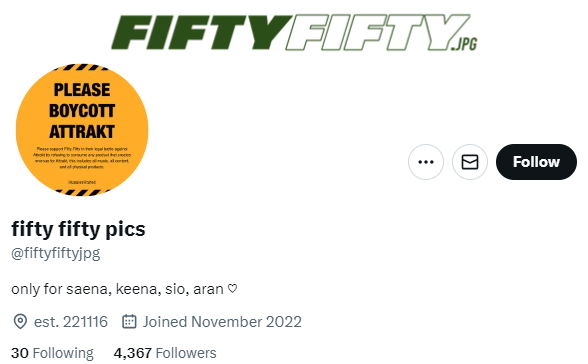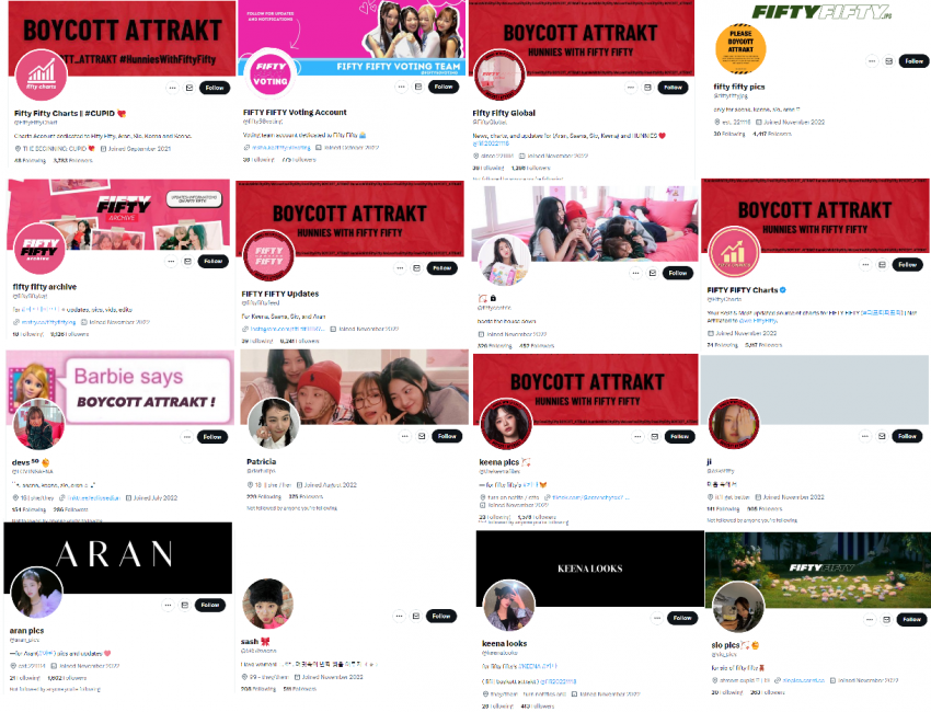 그 당시 만들어진 계정들은 처음엔 피프티 홍보를 했는데 2023년 6월 이후로 탬퍼링 활동에 동원됐고 이후에도 '어트랙트 보이콧' 계정으로 변화했습니다.